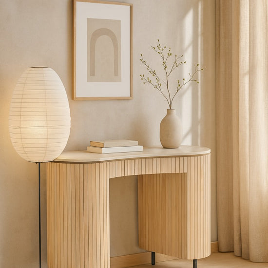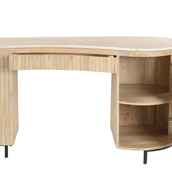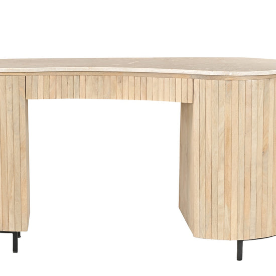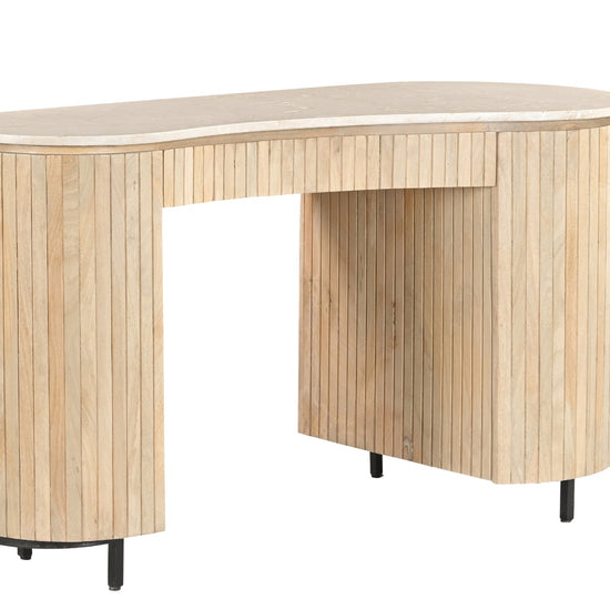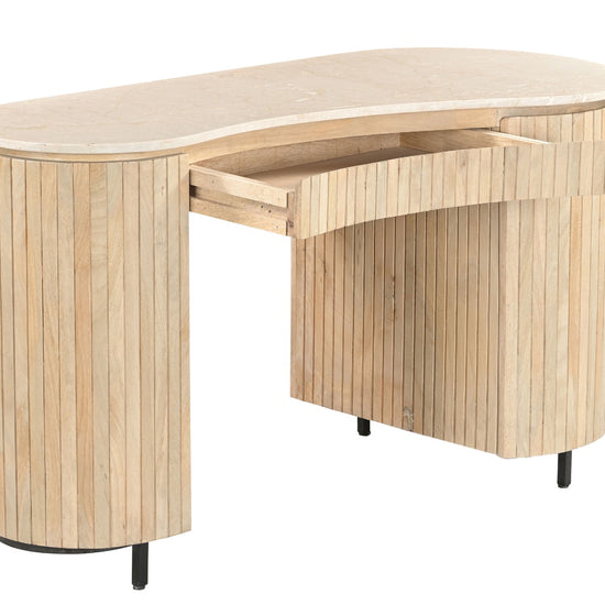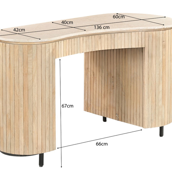Breng stijl en karakter in je werkruimte met het Dexter bureau. Dit unieke bureau is geïnspireerd op natuurlijke vormen en combineert een elegant organisch marmeren blad met een warm mangohouten onderstel. De verfijnde latstructuur en zachte rondingen geven het bureau een eigentijdse en luxe uitstraling.