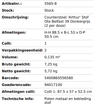 COUNTERSTOEL 'ARTHUR' STOF OTE BELFAST 39 DONKERGRIJS