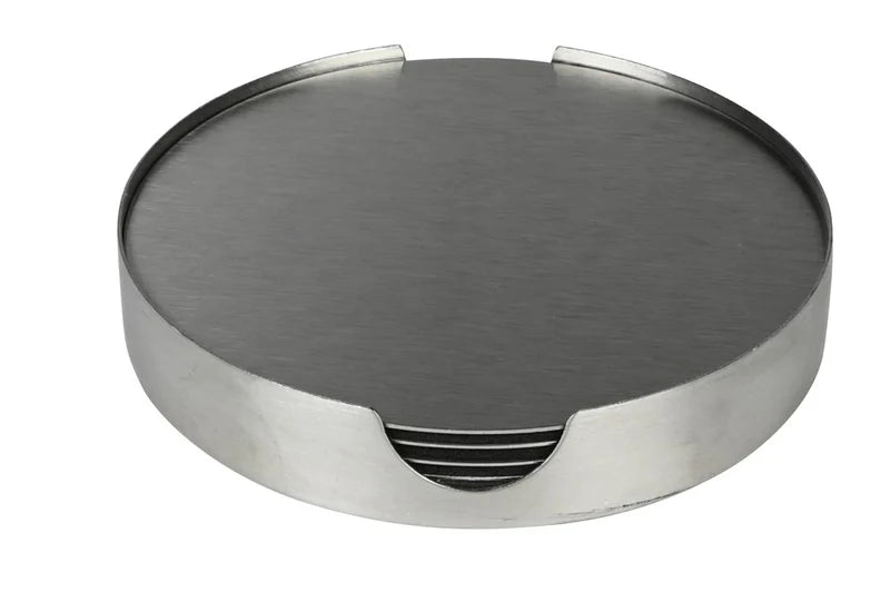 Bescherm je tafel op een stijlvolle manier met deze moderne set van 6 zilverkleurige RVS onderzetters, inclusief een praktische houder. De onderzetters hebben een strakke, matte metallic look (zoals op de foto) en passen perfect in elk interieur: modern, industrieel of minimalistisch.