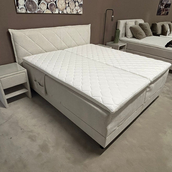 Dit tweepersoonsbed bestaat uit twee afzonderlijk elektrisch verstelbare ligvlakken.