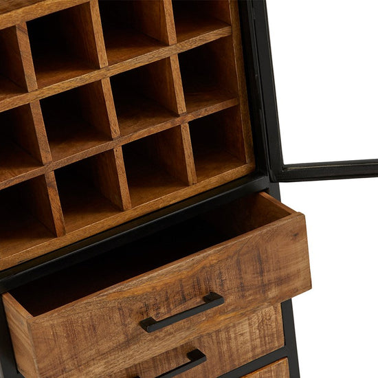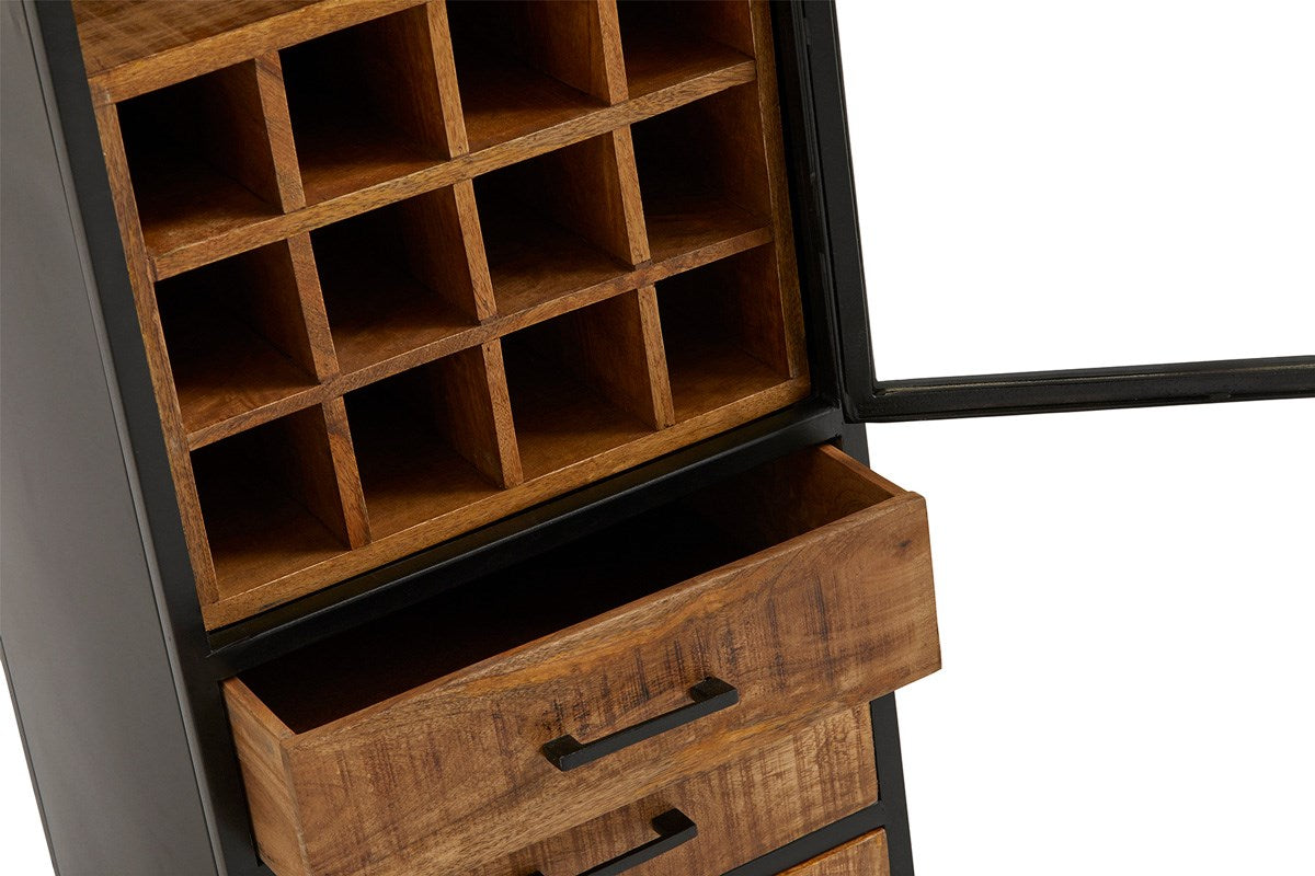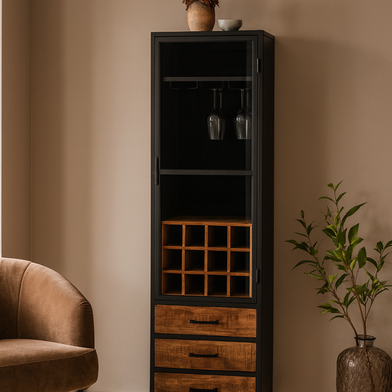 Industriële Wijnkast met Glazen Deur – Zwart Metaal & Mangohout