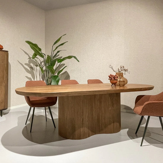 Ontdek de unieke Sevilla eetkamertafel die uit duurzaam hardhout is vervaardigd. Deze prachtige eetkamertafel kenmerkt zich door de middenpoot met een golvend design, dat een vleugje elegantie toevoegt aan elke ruimte. Met de Sevilla eetkamertafel haalt u een waar pronkstuk in huis, perfect passend in uw interieur.