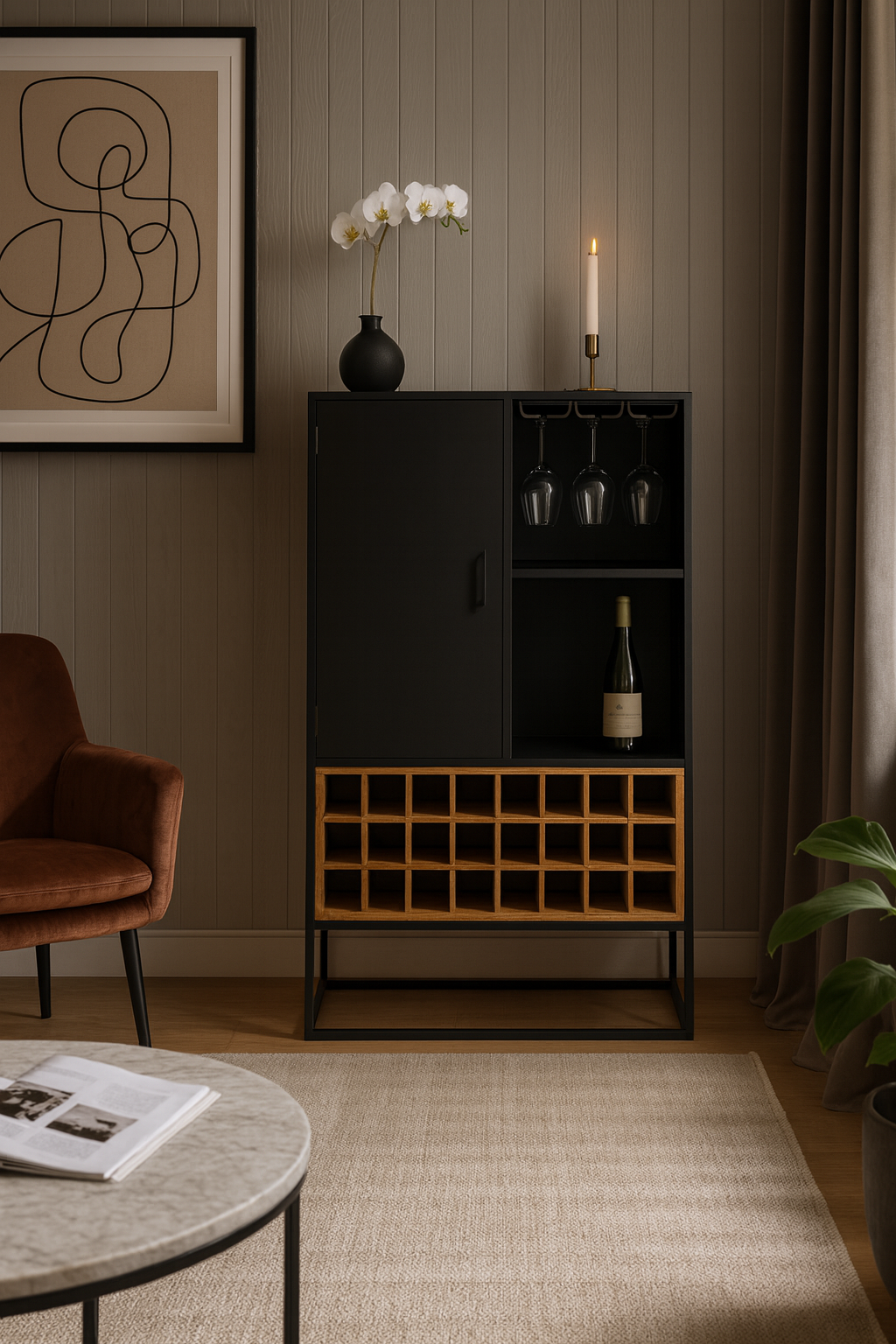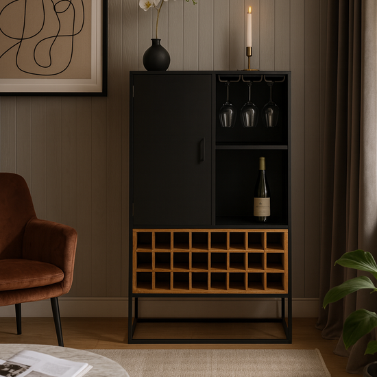 Met zijn compacte afmetingen van 80 × 40 × 135 cm past de kast moeiteloos in elke woonkamer, keuken of eetruimte, terwijl hij toch royaal opbergruimte biedt voor jouw wijncollectie en baraccessoires.