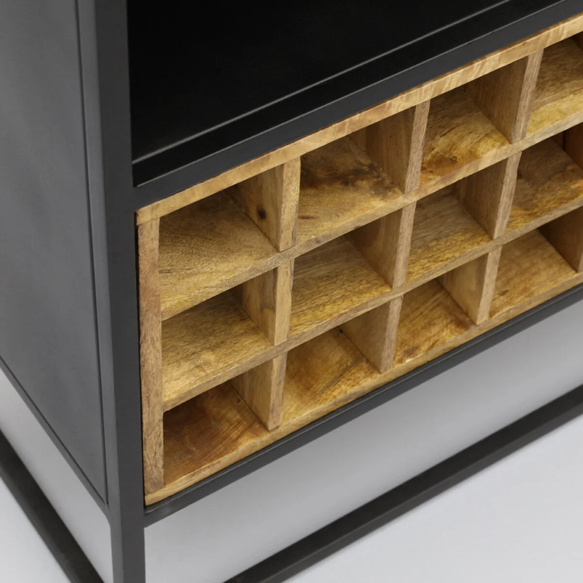 Breng luxe en karakter in jouw interieur met deze stijlvolle industriële wijnkast. Het moderne zwarte metalen frame vormt een prachtig contrast met het warme mangohout, waardoor dit meubel direct een verfijnde en chique uitstraling krijgt.
